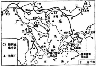 (江苏省苏州市2010届高三上学期期初调研)20世纪80年代,香港的印刷业发展很快,印刷能力曾占全球印刷市场的6%。由于加拿大等国纸张出口量减少,香港将部分印刷厂向广东省迁移。到2004年,珠江三角洲地区(包括香港、澳门)印刷能力已经超过美国东北部。读珠江三角洲地区印刷工业和造纸工业分布图(右下图),回答6-7题。![]()