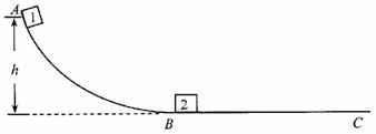 如图所示,AB为光滑圆弧轨道,BC是粗糙水平轨道,两轨道首尾平滑连接于B点。质量为M的物块2静置于水平轨道的左端B点。现把质量为肌的物块l从圆弧轨道h高处由静止释放,在下滑到圆弧轨道末端时与物体2发生正碰,碰后物块1恰能返回圆弧轨道