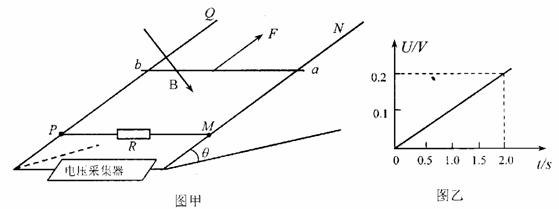 =30°,两导轨间距L=0.3m。导轨电阻忽略不计,其间连接有阻值R=0.4Ω的固定电阻。开始时,导轨上固定着一质量m=0.1kg、电阻r=0.2Ω的金属杆ab,整个装置处于磁感应强度B=0.5T的匀强磁场中,磁场方向垂直导轨面向下。现拆除对金属杆ab的约束,同时用一平行金属导轨面的外力F沿斜面向上拉金属杆ab,使之由静止开始运动。电压采集器可将尺两端的电压U即时采集并输入电脑,获得的电压U随时间t变化的关系如图乙所示。求: