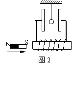 如图2所示,螺线管导线的两端与两平行金属板相接,一个带负电的小球用绝缘丝线悬挂在两金属板间,并处于静止状态,若条形磁铁突然插入线圈时,小球的运动情况是 ( )