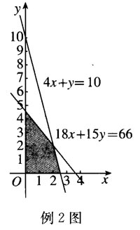 例2 一个化肥厂生产甲、乙两种混合肥料,生产1车皮甲种肥料需要的主要原料是磷酸盐4吨、硝酸盐18吨,产生的利润为10 000元;生产1车皮乙种肥料需要的主要原料是磷酸盐1吨、硝酸盐15吨,产生的利润为5 000元。现有库存磷酸盐10吨、硝酸盐66吨,在此基础上进行生产。请列出条件的数学关系式,并画出其图象。
