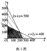 在这个问题中,使3x+2y取得最大值的(x,y)是两直线2x+y=500与x+2y=400的交点(200,100)。