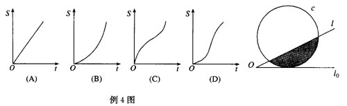 例4 如图,直线l和圆c,当l从l0开始在平面上绕点O匀速旋转(旋转角度不超过90o)时,它扫过的圆内阴影部分的面积S是时间t的函数,它的图象大致是( )。