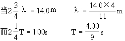 例9 如图6-17所示,一根张紧的水平弹性长绳上的a,b两点,相距14.0m,b点在a点的右方,当一列简谐横波沿此长绳向右传播时,若a点的位移达到正最大时,b点的位移恰为零且向下运动。经过1.00s后a点的位移为零,且向下运动,而b点的位移恰达到负最大,则这简谐波的波速可能等于 [ ]