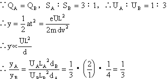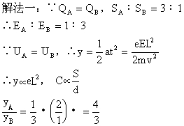 例17 有两个带电量相等的平行板电容器A和B,它们的正对面积之比SA∶SB=3∶1,板长之比∶LA∶LB=2∶1,两板距离之比dA∶dB=4∶1,两个电子以相同的初速度沿与场强垂直的方向分别射入两电容器的匀强电场中,并顺利穿过电场,求两电子穿越电场的偏移距离之比。