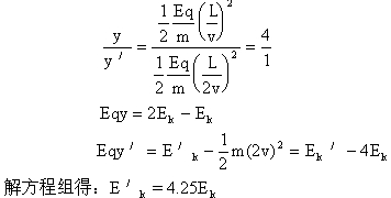 建立直角坐标系,初速度方向为x轴方向,垂直于速度方向为y轴方向。设粒子的的质量m,带电量为q,初速度v;匀强电场为E,在y方向的位移为y。速度为2v时通过匀强电场的偏移量为y′,平行板板长为L。