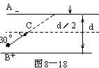 例20、 1000eV的电子流在两极板中央斜向上方进入匀强电场,电场方向竖直向上,它的初速度与水平方向夹角为30°,如图8-18。为了使电子不打到上面的金属板上,应该在两金属板上加多大电压U?