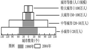 29.(省延边二中2010届高三第三次阶段性测试)经济发展推动了我国的城市化进程,图18是我国改革开放以来全国及三大经济地带城市化水平的变化情况,图19是我国1980年和2004年城市等级规模金字塔示意图,读图回答下列小题。