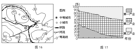 20. (江苏省淮安市2009届高三第二次调研考试)图16是“我国东部沿海某地区城市分布图”,图17是“该地区1976年-2008年产业结构变化情况”。读图完成下列问题。