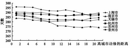 (山东省淄博市2010届高三上学期第一次月考)下图为六城市边缘区植被生长期变化坐标图,读图完成第8-9题。