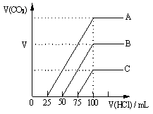 (6分)取等物质的量浓度的NaOH溶液A、B、C三等份各100 mL,分别向三份溶液中通入不等量的CO2气体,充分反应后,再向三份所得的溶液中逐滴加入0.2 mol/L的盐酸,标准状况下产生的CO2气体体积与所加盐酸的体积之间的关系如图所示。试
