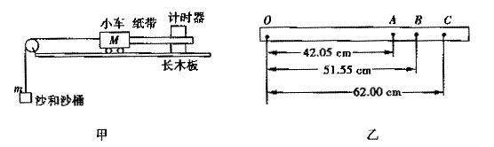 (1)在此实验中,此同学先接通计时器的电源(频率为50Hz),再放开纸带,如图乙是在m=100g,M=1kg情况下打出的一条纸带,O为起点,A、B、C为三个相邻的计数点,相邻的计数点之间有四个点没有标出,有关数据如图所示,其中sA=42.05cm,sB=51.55cm,sC=62.00cm,则小车的加速度为a=___________m/s2,打B点时小车的速度vB=_______m/s(保留2位有效数字)