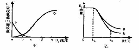 (1)甲图中 曲线表示无氧呼吸过程中二氧化碳的释放量,氧浓度为d时种子的呼吸方式是 。若P代表的呼吸方式在氧浓度为b时消耗了Amol的葡萄糖,则Q代表的呼吸方式在氧浓度为b时消耗的葡萄糖为 。