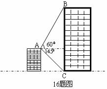 16.(10重庆潼南县)如图所示,小明在家里楼顶上的点A处,测量建在与小明家楼房同一水平线上相邻的电梯楼的高,在点A处看电梯楼顶部点B处的仰角为60°,在点A处看这栋电梯楼底部点C处的俯角为45°,两栋楼之间的距离为30m,则电梯楼的高BC为______米(精确到0.1).(参考数据: