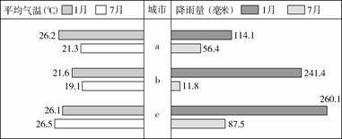 (1)结合所提供的信息,比较a、b、c三城市的l月、7月平均气温与降雨量,写出温差变