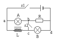 1.如图所示,A、B是电阻均为R的电灯,L是自感系数较大的线圈,当S1闭合,S2断开且电路稳定时,A、B亮度相同,再闭合S2,待电路稳定后,将S1断开,下列说法中正确的是:( )