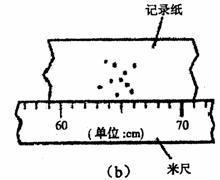 图(a)中,悬点正下方P点处放有水平放置炽热的电热丝,当悬线摆至电热丝处时能轻易被烧断,小球由于惯性向前飞出作平抛运动。在地面上放上白纸,上面覆盖着复写纸,当小球落在复写纸上时,会在下面白纸上留下痕迹.用重锤线确定出A、B点的投影点N、M。重复实验10次(小球每一次都从同一点由静止释放),球的落点痕迹如图(b)所示,图中米尺水平放置,零刻度线与M点对齐。用米尺量出AN的高度