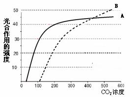 下图表示在适宜温度、水分和一定的光照强度下,两种植物的叶片在不同CO2浓度下的光合作用强度,下列叙述正确的是( )