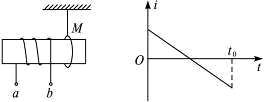 线圈ab中的电流如图所示,设电流从a到b为正方向,那么在0~t0这段时间内,用丝线悬挂的铝环M中产生感应电流,从左向右看,它的方向是(