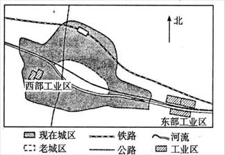 28.右图为某城市两个工业区的分布示意图,东部工业区包括冶炼厂、钢铁厂、石化厂等,西部工业区包括焦化厂、水泥厂等。该地盛行南风,回答下列问题。(10分)