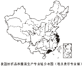 (2)目前,我国已成为世界上最大的纺织品、服装生产和出口国,并出现了众多专业镇。专业镇从事纺织、服装生产的企业可达数千家,从业人员可达数万人。从上图可以看出,我国纺织、服装专业镇主要分布在 什么地区.