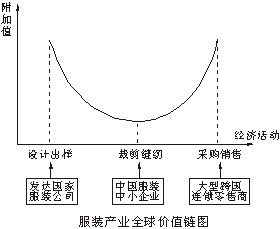 (3)读下图,说明目前我国多数出口服装企业所从事的经济活动,在整个服装产业价值链中所处的地位及今后的发展策略。