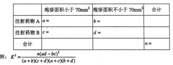 表1:注射药物A后皮肤疱疹面积的频数分布表