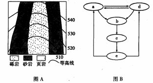 读图A,沉积岩的形成符合颗粒大的先沉积,形成砾岩;颗粒小的后沉积形成页岩的规律。图B是五种外力作用相互联系示意图,回答10-11题。