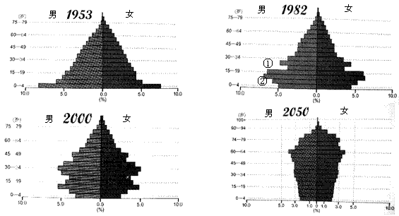 (五)读我国人口金字塔变化图回答。(12分)