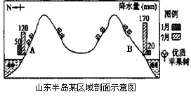 地貌类型。读山东半岛某区域南北海岸剖面示意图,试分析A、B两地降水量季节差异并简要说明原因: