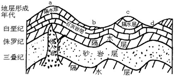 57.就地质构造而言,a、c、d三处为向斜构造的是 。c处的地形是 ,形成该地形的原因 。