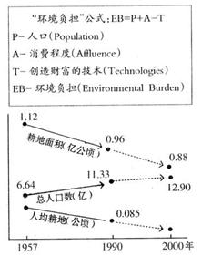 (山东省临沂一中2010届高三11月综合训练)环境的承载能力是有限的,读“环境负担公式”和“我国人口与耕地变化图”,完成6-7题。