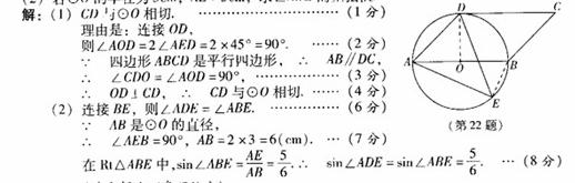 (2010山西22.(本题8分)如图,四边形ABCD是平行四边形,以AB为直径的⊙O经过点D,E是⊙O上一点,且∠AED=45º.
