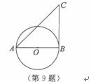 (2010·浙江温州)9.如图,在AABC中,AB=BC=2,以AB为直径的⊙0与BC相切于点B,则AC等于(C)