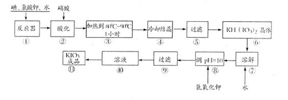 酸、二氧化硫等还原性物质作用,被还原为单质碘,在碱性介质中,碘酸钾能被氯气、次氯酸盐等氧化为高碘酸钾。碘酸钾在常温下稳定,加热至560℃开始分解。工业生产碘酸钾的流程如下,在反应器中发生反应的化学方程式为:I2+KClO3+H2O→KH( IO3)2+KCl+ Cl2
