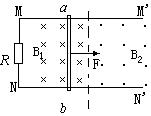 如图所示,水平放置的光滑金属长导轨MM′ 和NN′之间接有电阻R,导轨左、右两区域分别处在方向相反与轨道垂直匀强磁场中,方向如图所示,设左、右区域磁场的磁感应强度为B1和B2,虚线为两区域的分界线。一根金属棒ab放在导轨上并与其正交,棒和导轨的电阻均不计。金属棒在水平向右的恒定拉力作用下,在虚线左边区域中恰好以速度为v做匀速直线运动,导轨足够长,则可知( )