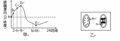 (3)若玻璃罩内植株所有进行光合作用的细胞的光合作用强度相同,图乙示该植株一个进行光合作用的细胞,那么,当在图甲中D点时,图乙中m ____ n。(大于、等于、小于)