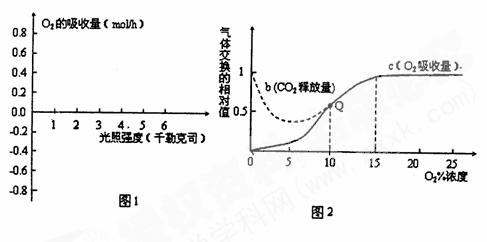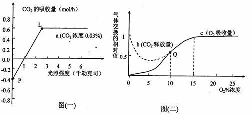 ①图(一)中光合作用强度是用CO2吸收量(mol/h)表示的,如果改为O2的吸收量(mol/h)表示,请在图1中绘出光合作用强度与光照强度的关系曲线;