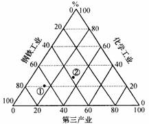 德国鲁尔区从20世纪60年代到80年代,经济结构进行大规模的调整,根据下面的鲁尔区产值结构图(图中①表示1958年,②表示1995年)及所学知识判断21、22题。