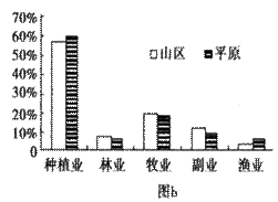 (3)特点:山区和平原地区均以种植业为主,牧业和副业次之,渔业和林业所占比重较小。 存在的问题:种植结构单一;土地利用不合理。
