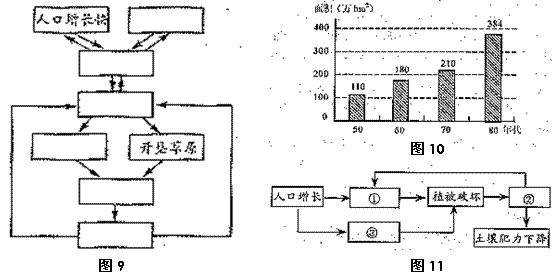 46、图9表示黄土高原人口、粮食与环境之间的关系;图10表示20世纪江西水土流失面积增长情况;图11表示江西省低山丘陵区人地关系。据图完成下列要求(13分)