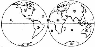 ⑵请将图中所代表的大洋的名称填写在相应横线上。(4分)