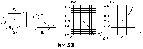 ②第二组同学也利用图7的连接测量另一节干电池,初始时滑片P在最右端,但由于滑动变阻器某处发生断路,合上电键后发现滑片P向左滑过一段距离x后电流表有读数,于是该组同学分别作出了电压表读数U与x、电流表读数I与x的关系图,如图9所示,则根据图像可知,电池的电动势为 V,内阻