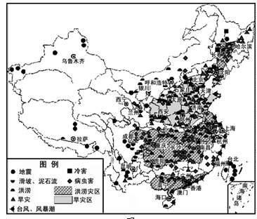 45、读材料回答下列问题。(10分) 材料一:中国主要自然灾害分布图。