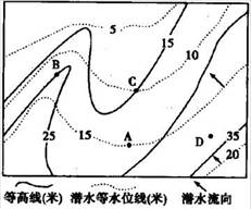 潜水等水位线图就是潜水面等高线图,它是根据潜水面上各点的水位标高绘制成的,一般绘制在地形图上,绘制的方法与绘制地形等高线的方法类似。读“潜水等水位线图”,回答下面4-6: