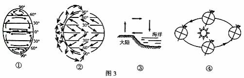 8.图3中四幅图分别表示世界洋流模式图.三圈环流模式图.海陆间水循环示意图和地球公转运动示意图,正确的是 ( )
