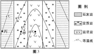 图3是我国东部某地区岩石与1月均温等值线分布图,读图,回答12-14题。