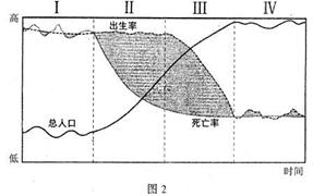 表1是某国出生率.死亡率的变化情况,图2是人口增长模式图。回答第15-16题。
