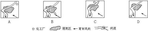 30.某城市计划建设一个化工厂,图中四种布局方案较合理的一种是 ( )