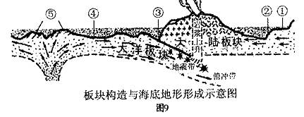 (1)说出图中①②③④⑤所代表的海底地形类型。